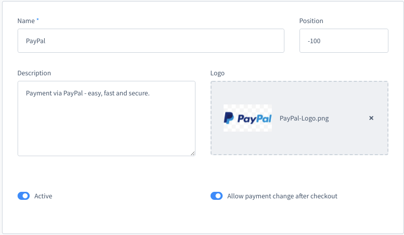 The integration of the payment methods works via the Shopware standard. Settings -> Payment methods.